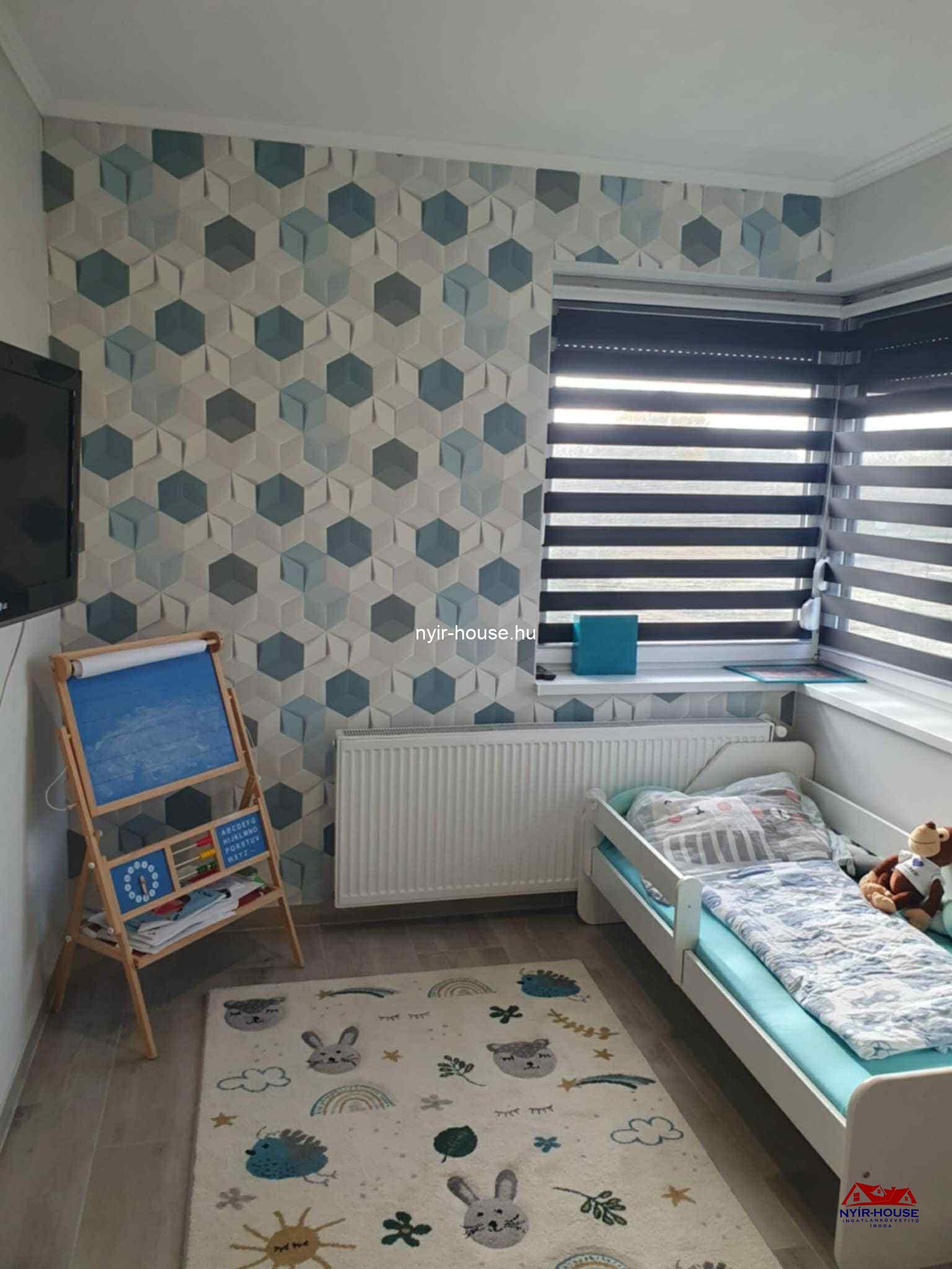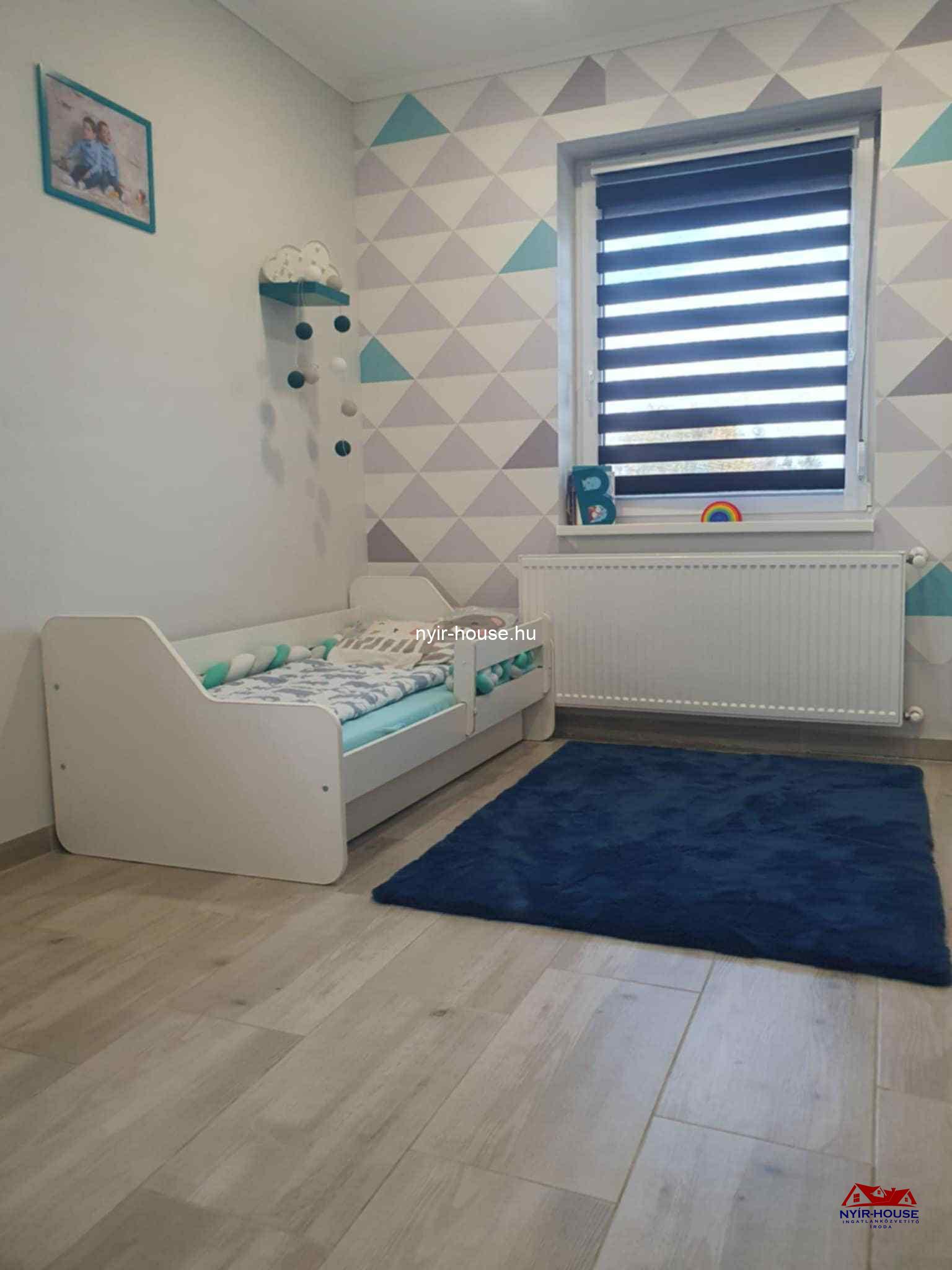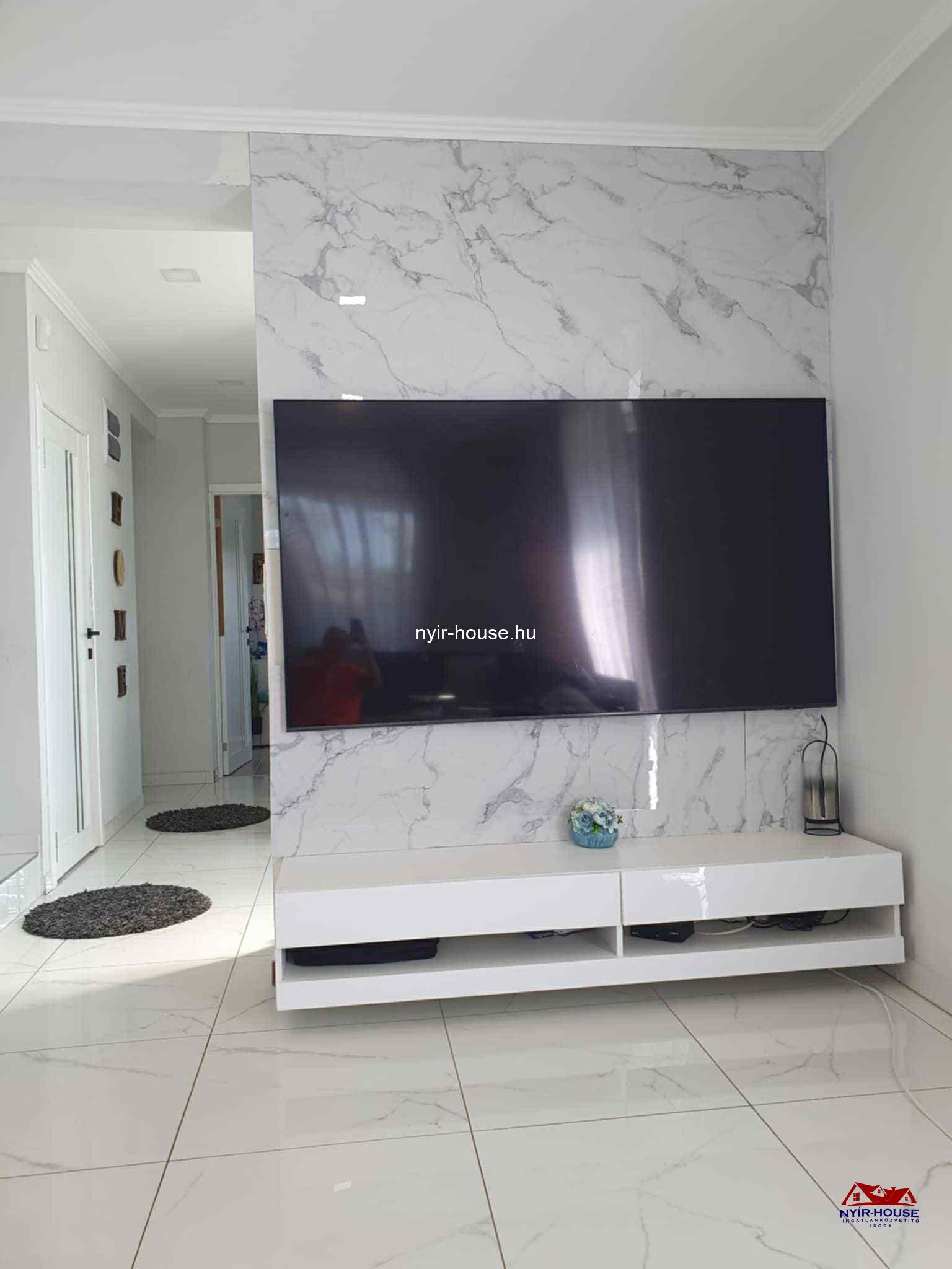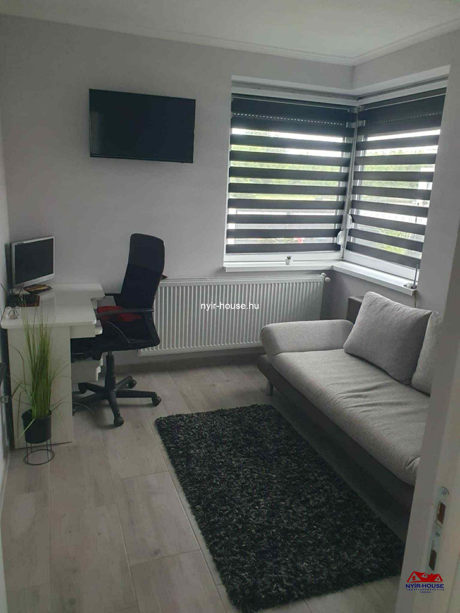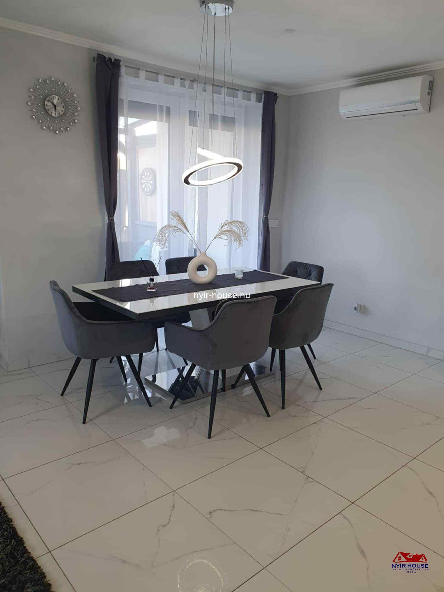 A földszinten egy tágas, amerikai konyhás nappali kapott helyet, beépített konyhabútorral és elektromos gépekkel, továbbá egy különálló szoba, egy fürdőszoba, egy külön WC, egy 18,5 nm-es terasz. Az emeleten három külön nyíló szoba, egy gardróbhelyiség, egy fürdőszoba, egy külön WC és egy 6,7 nm-es erkély található. A burkolatok és a szaniterek megkímélt, kiváló állapotúak.