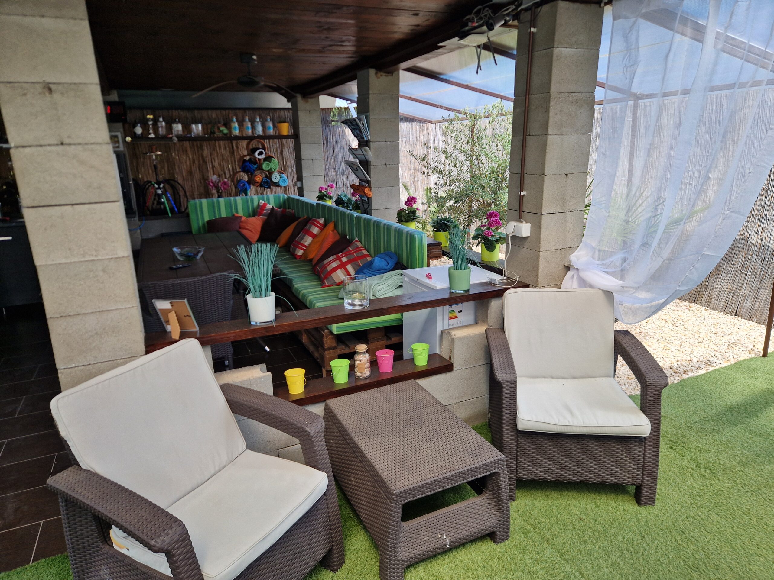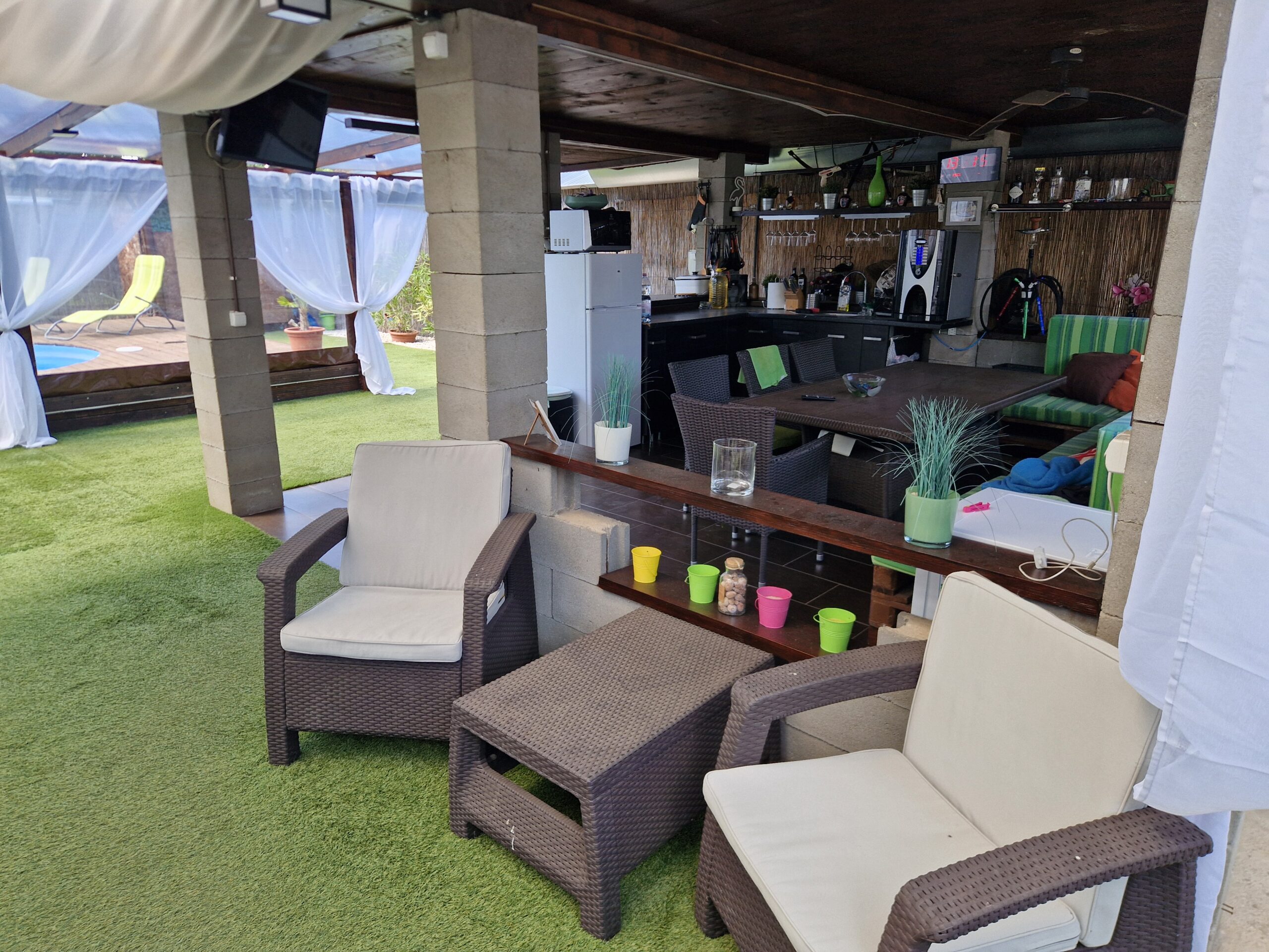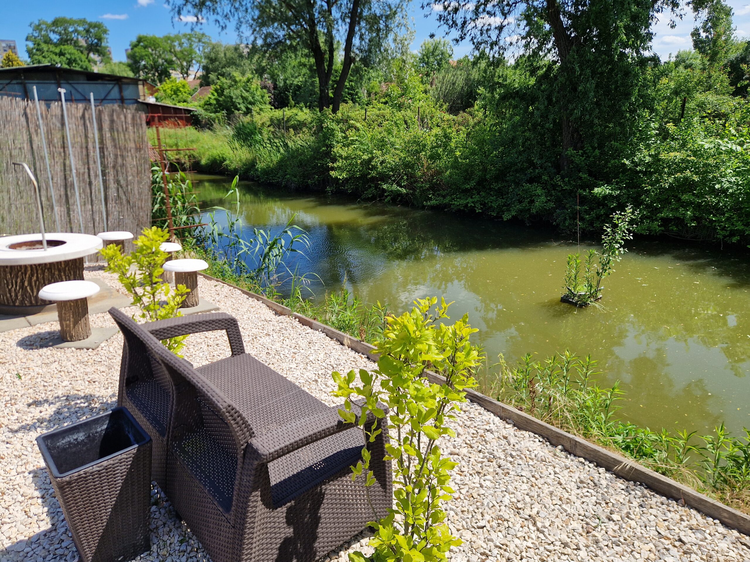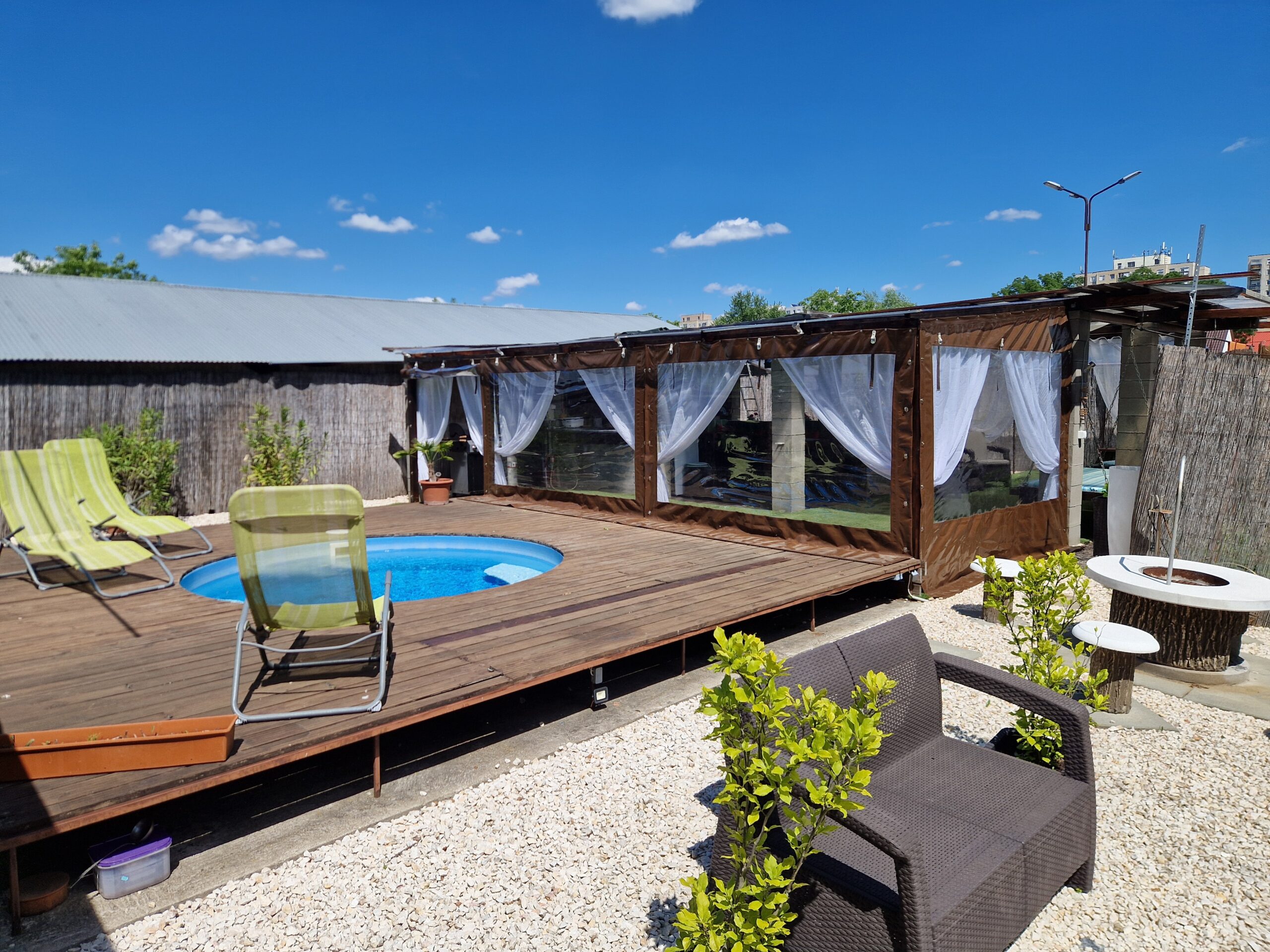 A lakáshoz saját kertrész tartozik, ahol medence, fedett terasz és kültéri, teljesen felszerelt konyha is rendelkezésre áll, így a pihenés és a szabadtéri étkezés is kényelmesen megoldható.