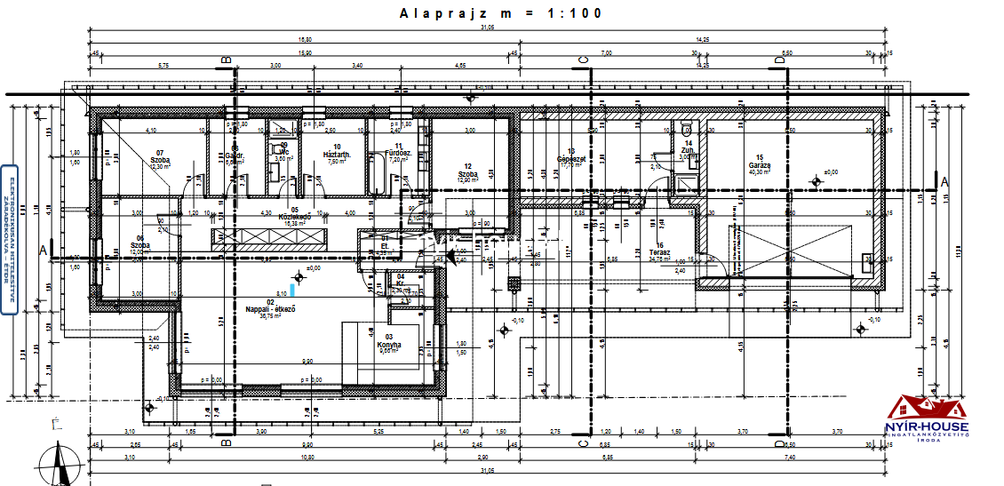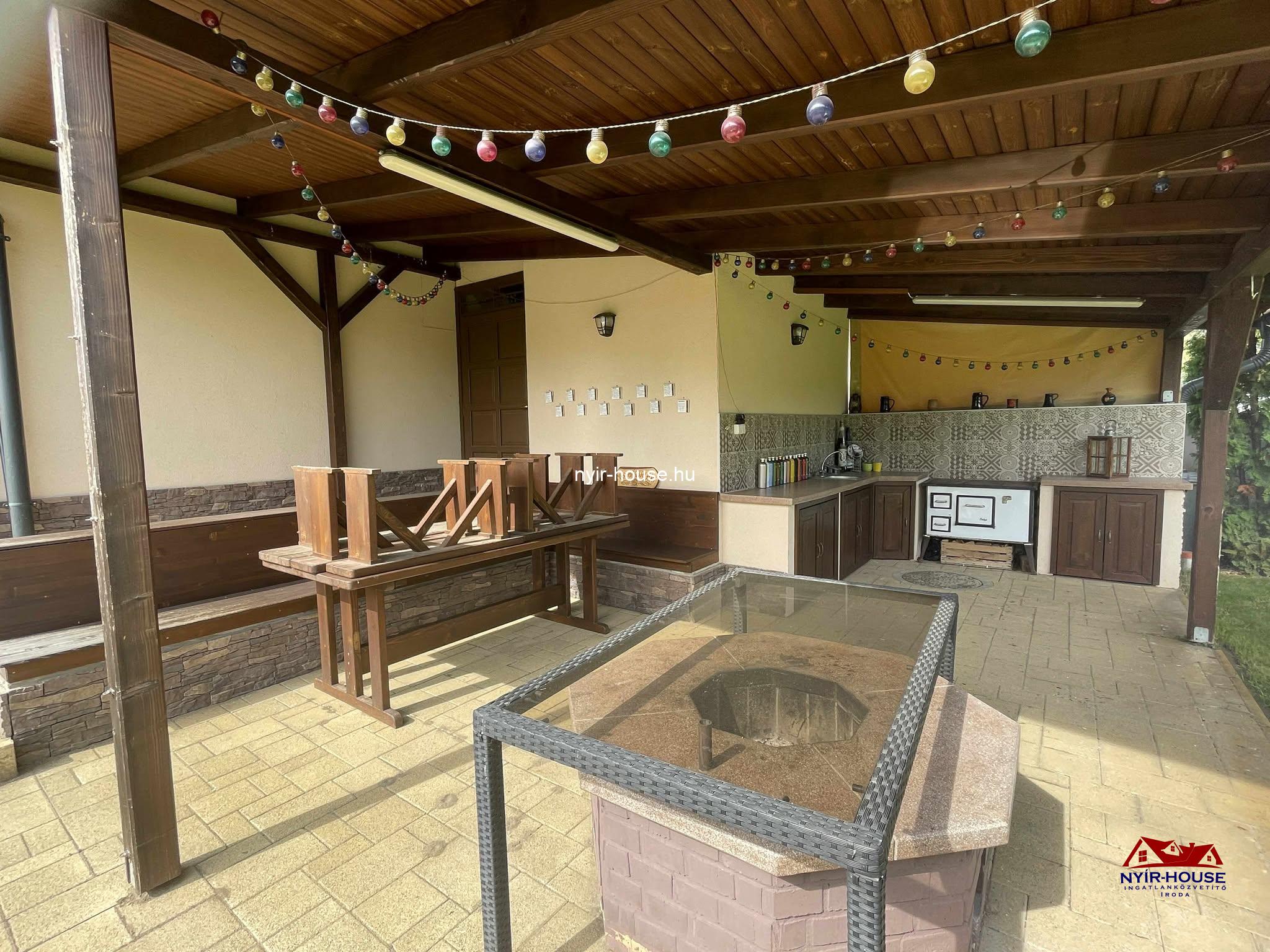 A házhoz tartozik egy teljesen külön bejáratú, 20 m²-es helyiség saját mosdóval és zuhanyzóval, amely tökéletes vállalkozás, iroda vagy rendelő kialakítására. A kétállásos, 40 m²-es garázs a lakótérrel egy 35 m²-es fedett terasszal kapcsolódik össze, amely kellemes pihenőhelyet kínál.