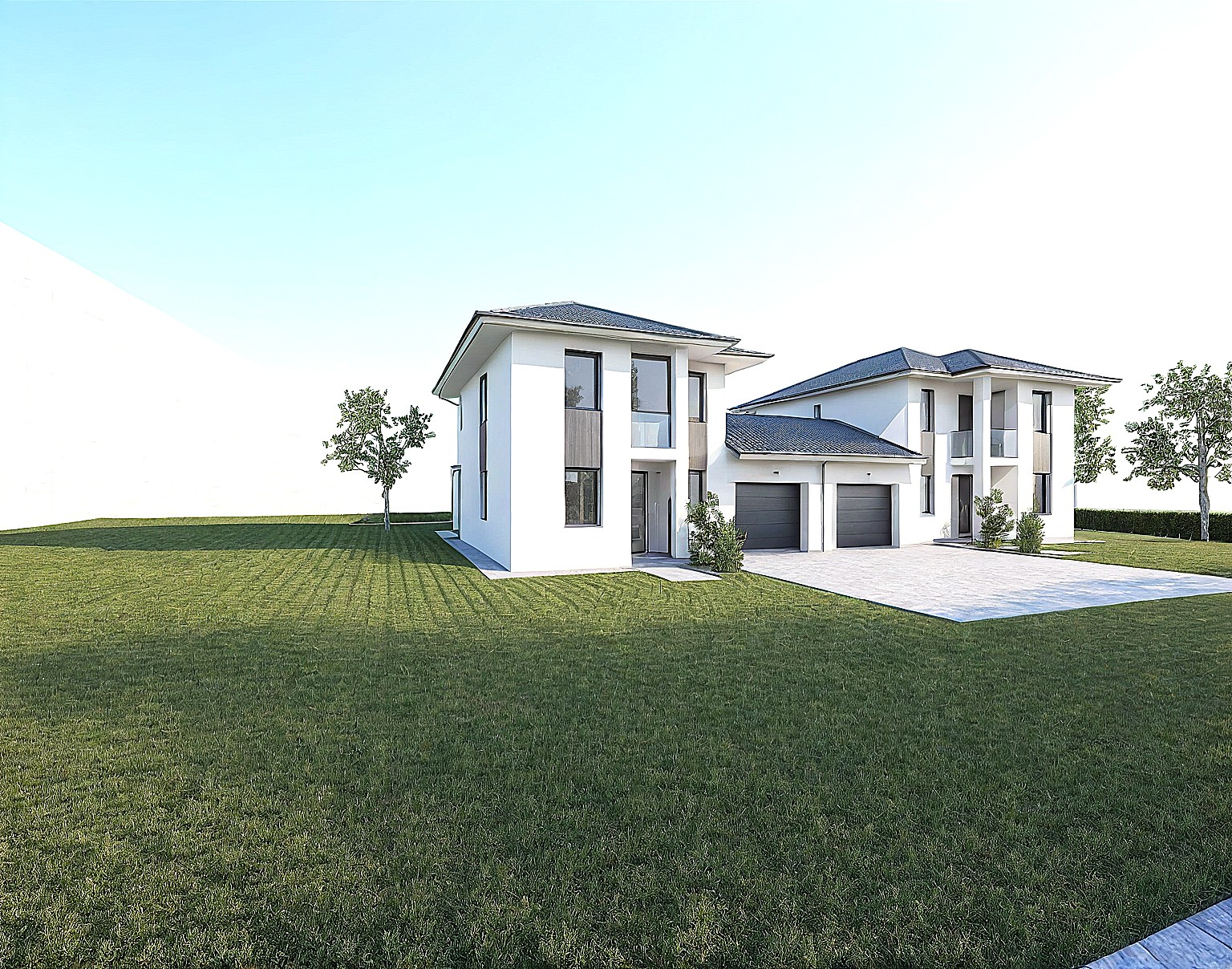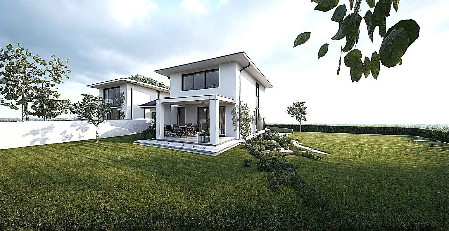 Az ikerfélhez 450 m²-es saját telekrész tartozik, térkövezett járdával és térkövezett kocsibeállóval.